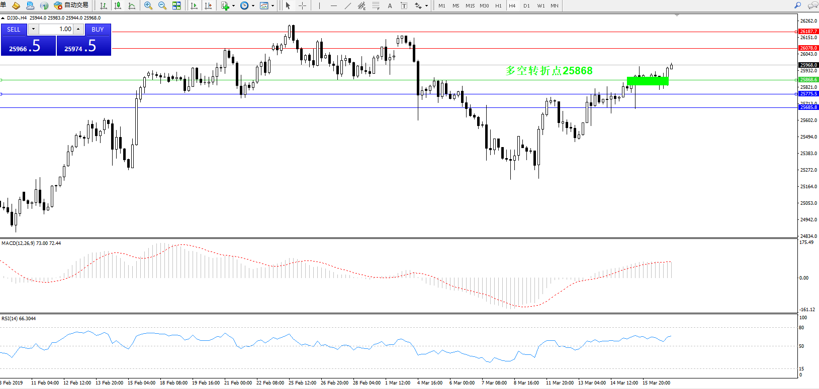 道琼斯指数周一盘上涨65.20点,涨幅0.25%,报25914.10点。道琼斯指数连续第四交易日收涨,银行股领涨,但波音和Facebook拖累股市。投资者关注美联储本周的会议,以确认其对“耐心”货币政策的承诺。石油和天然气、工业和金融等上涨的板块带领股指走高。据CME“美联储观察”:美联储今年3月维持利率在2.25%-2.5%区间的概率为98.7%,降息概率为1.3%;今年6月维持利率在该区间的概率为85.3%,降息25个基点和50个基点的概率分别为14.1%和0.6%。