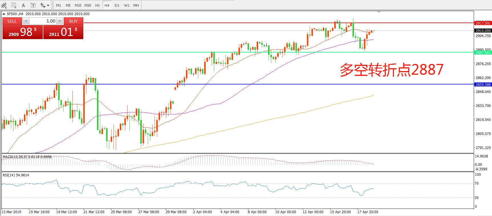 4小时图看,标普500触及2917阻力后再度回落,显示上方阻力较强,目前跌至55周期均线暂时企稳,MACD红柱减少,RSI指标向下,周一开盘后重点关注2887一线得失。