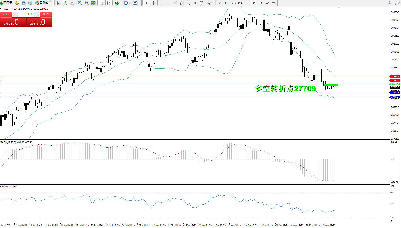 恒指HK50 ——4小时K线图显示: