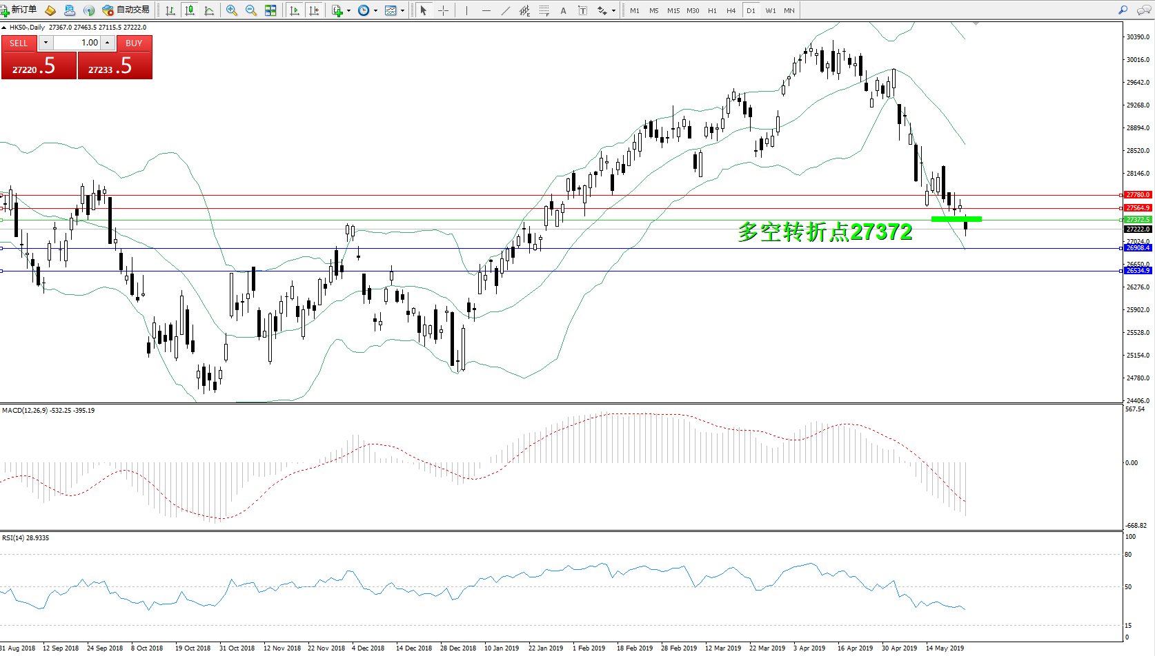 交易策略:27372下方看跌,目标26908、26534