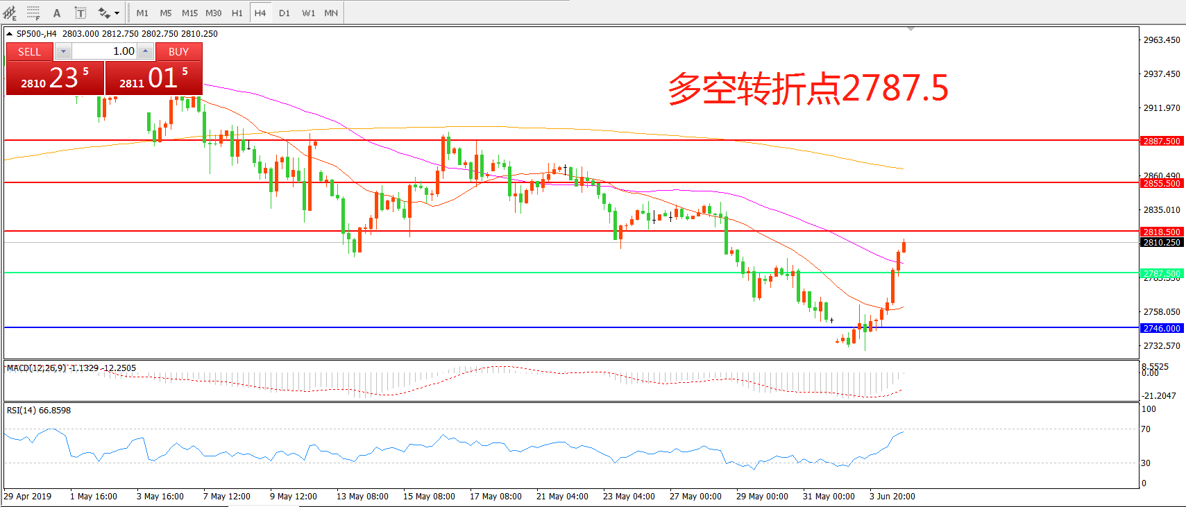 4小时图看,标普低位连续反弹,突破多空分水岭2787.5后直指上方阻力,短期均线有拐头迹象,MACD绿柱缩短,RSI指标拐头向上,日内有延续反弹可能。