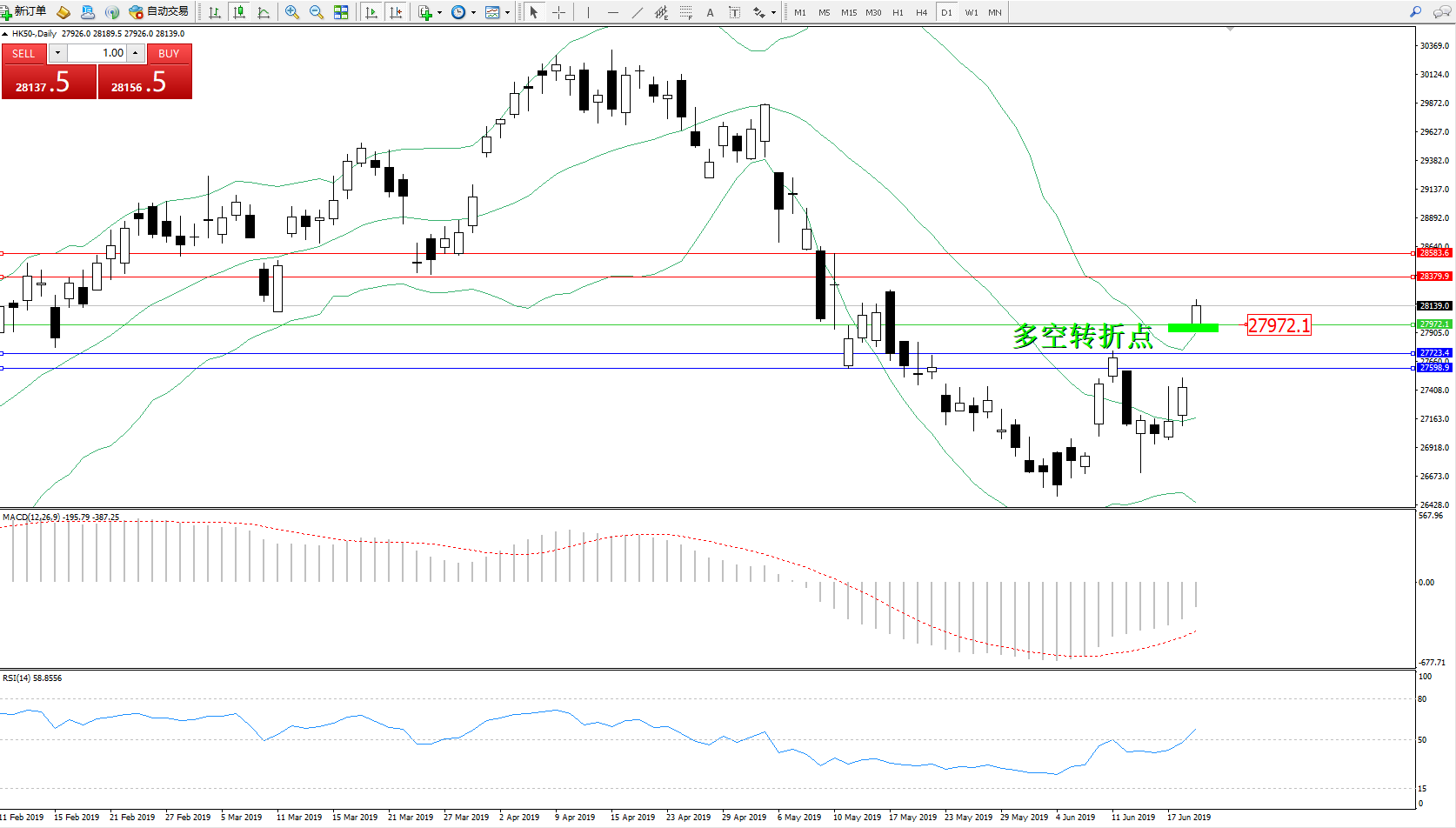 香港恒生指数6月19日(周三)收盘上涨703.37点,涨幅2.56%,报28202.14点;创今年来最大单日涨幅,恒指大市成交额报1051.49亿港元,显著高于上一交易日(669.02亿港元),创5月28日以来新高。港股近期有望随外围走势。两国元首电话通话,并将在二十国集团领导人大阪峰会期间举行会晤,显示出外部问题将有所缓和,有助于提振投资者情绪和人气,市场或将迎来一段宝贵的时间窗口,建议积极关注市场的反弹机会。