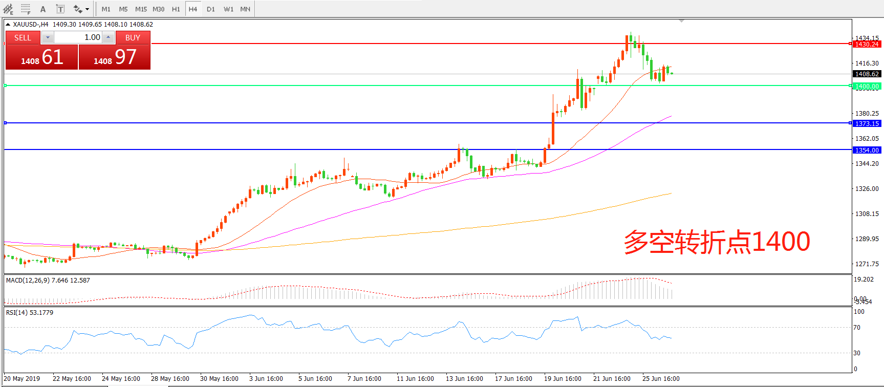 周三(6月26日) 因美联储官员的评论抑制了市场对降息规模的预期,引发投资者获利了结,金价近7个交易日以来首次下跌,日内一度下幅度达到1.5%,但仍处于1400关口之上。鸽派的美联储表态让黄金更具吸引力。美国和伊朗之间的紧张局势加剧以及贸易局面的不确定性进一步推动了黄金涨势,昨日瑞士信贷全球技术分析主管表示:“从更大的角度来看,考虑到已经过了6年时间才形成的基础规模,我们怀疑,我们甚至可能看到黄金再次测试记录高点。”