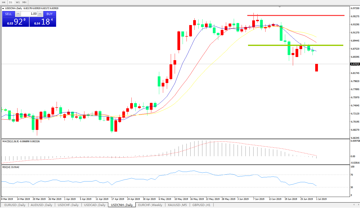 技术面简析:日线呈有序空头排列MACD下穿0轴且动能柱持续放量RSI逐步走低,G20贸易争端缓解预期落实,预计汇价大概率将进一步走低