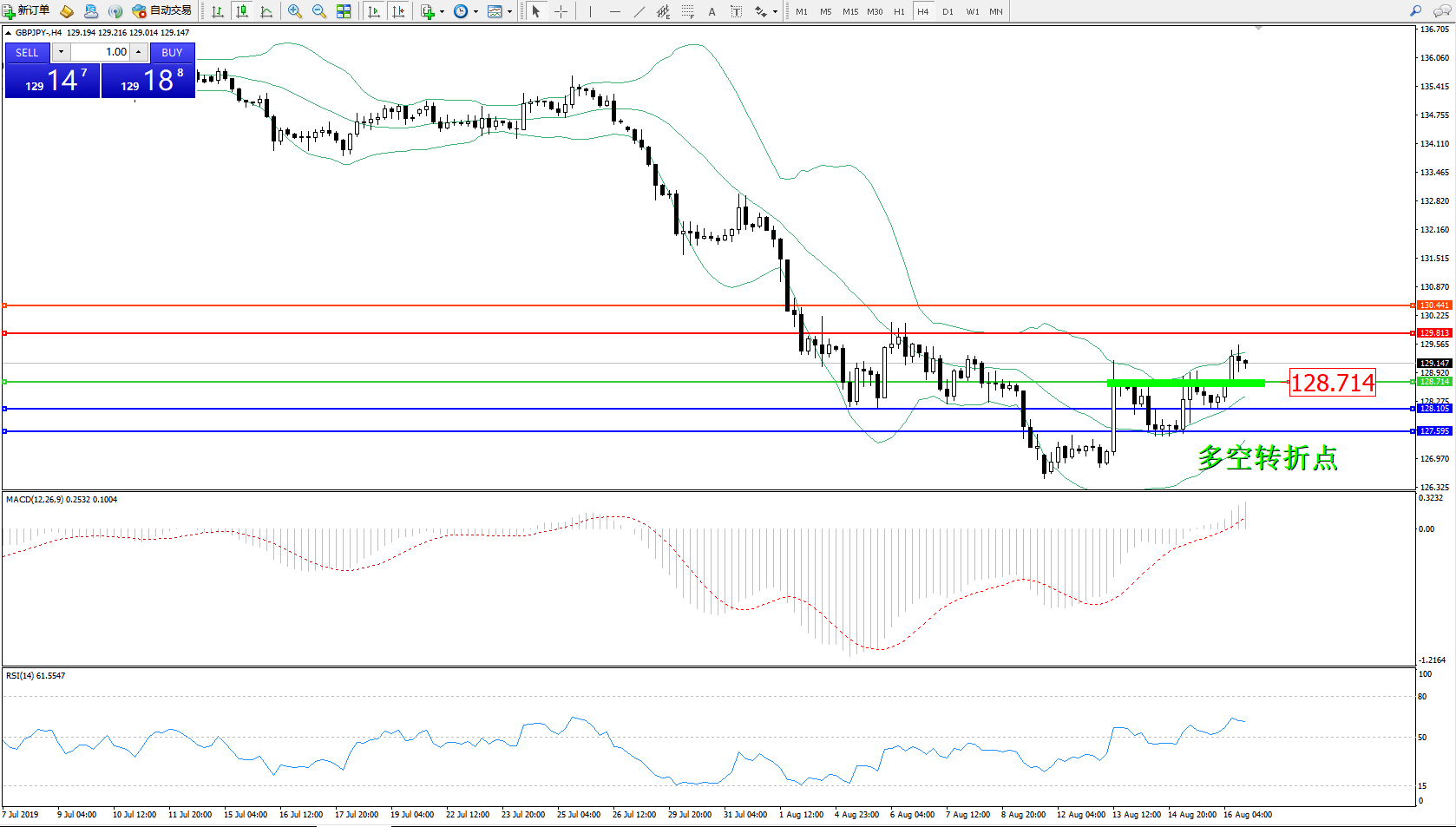 交易策略:128.714上方看涨,目标129.813130.441