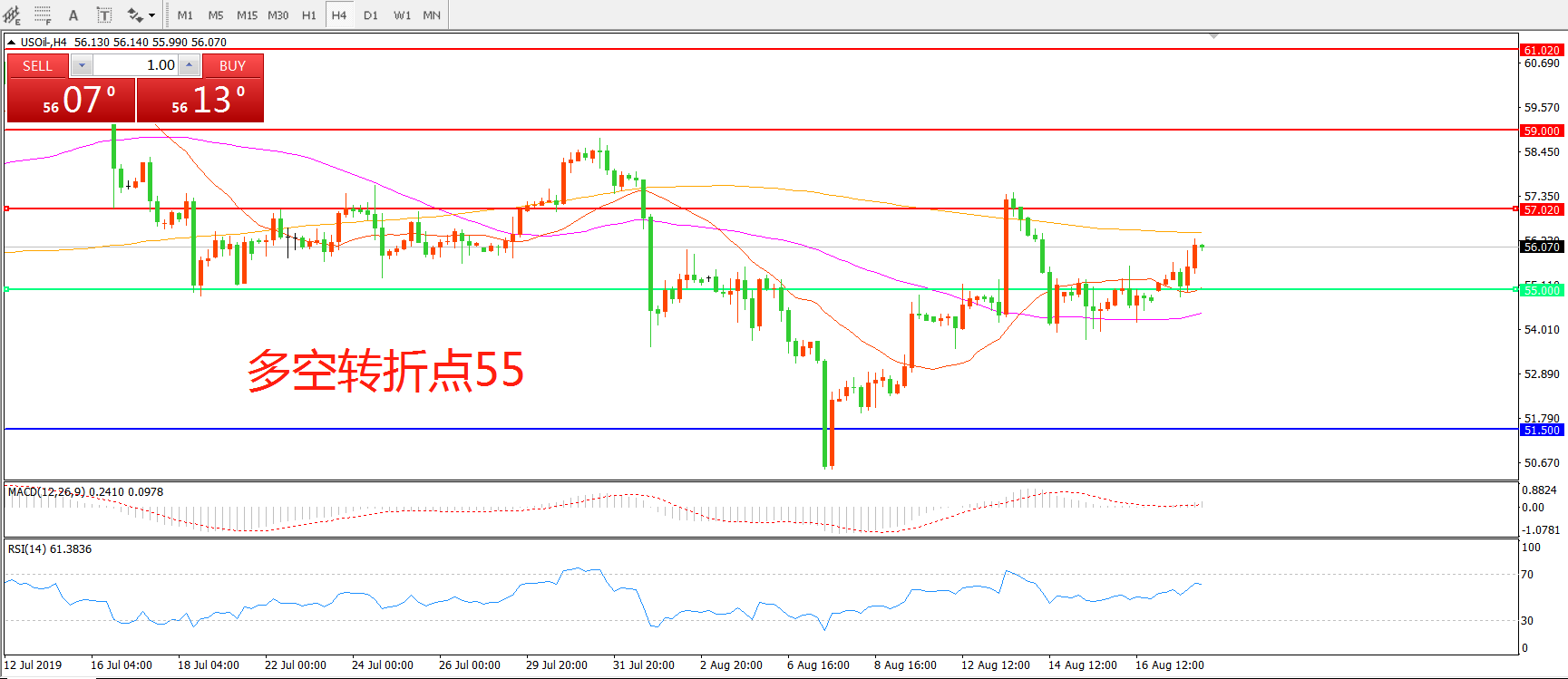 4小时图看,油价呈现震荡走高,55美元被突破形成下方支撑,200周期均线下压形成阻力,MACD红柱增加, RSI指标走平,日内震荡上行概率较大。