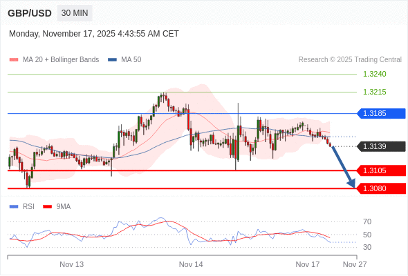 交易策略: 在 1.3185 之下,看跌,目标价位为 1.3105 ,然后为 1.3080 。