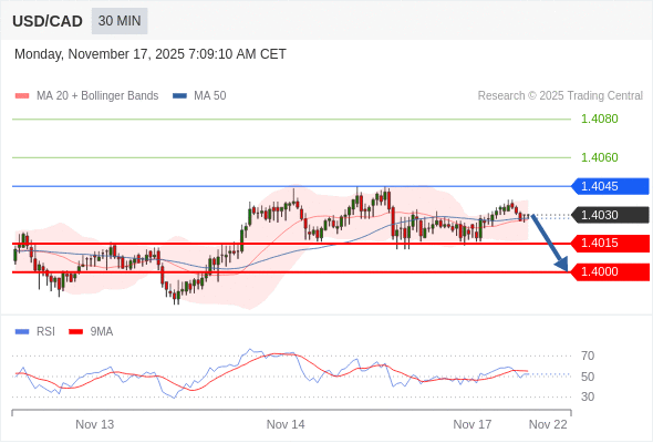 在 1.4045 之下,看跌,目标价位为 1.4015 ,然后为 1.4000 。