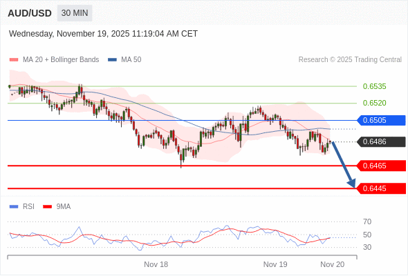 在 0.6505 之下,看跌,目标价位为 0.6465 ,然后为 0.6445 。