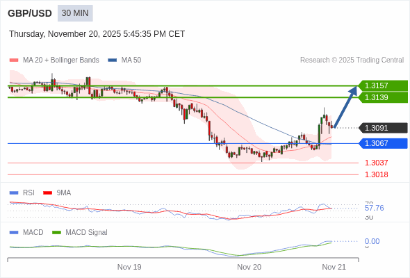 英镑/美元 当日内 : 看涨,当 1.3067 为支撑位。