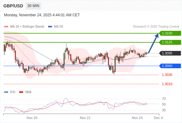 在 1.3060 之上,看涨,目标价位为 1.3125 ,然后为 1.3150 。
