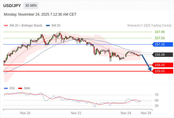 在 157.15 之下,看跌,目标价位为 156.00 ,然后为 155.65 。