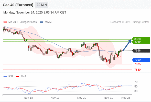 法国CAC指数期货 (Euronext) (X5) 当日内: 超短线(当日内)支撑位在7910附近。
