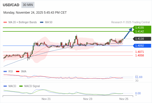 美元/加元 当日内 : 看涨,当 1.4092 为支撑位。