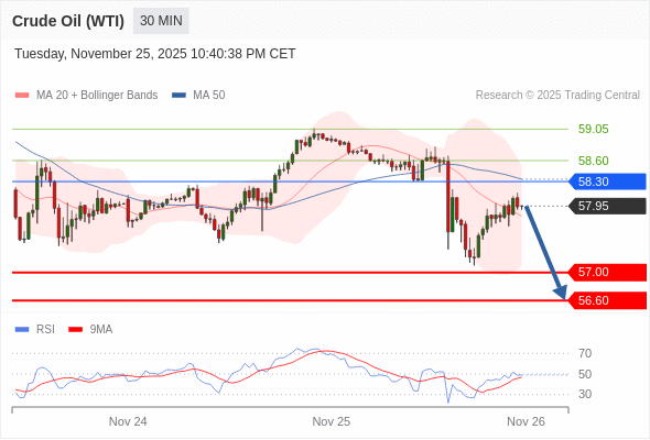 在 58.30 之下,看跌,目标价位为 57.00 ,然后为 56.60 。