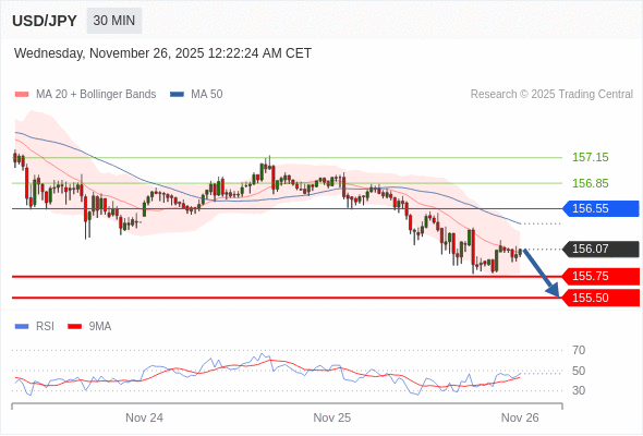 在 156.55 之下,看跌,目标价位为 155.75 ,然后为 155.50 。