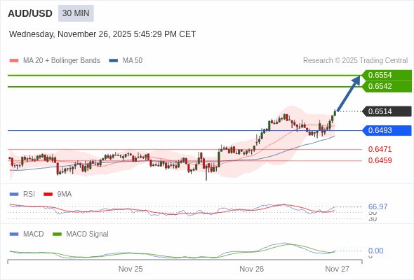 澳元/美元 当日内 : 看涨,当 0.6493 为支撑位。