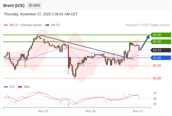 在 61.90 之上,看涨,目标价位为 62.60 ,然后为 62.90 。