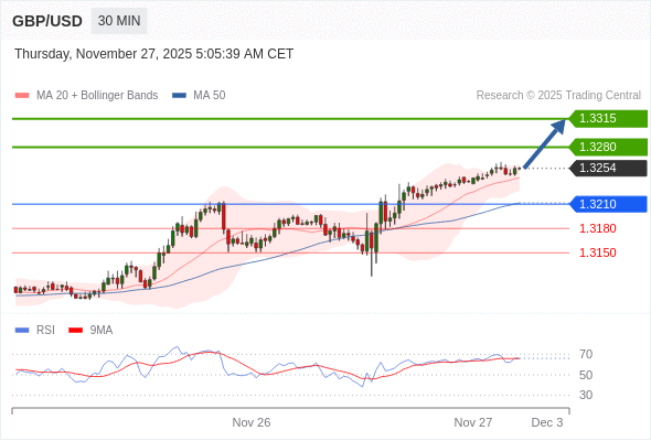 在 1.3210 之上,看涨,目标价位为 1.3280 ,然后为 1.3315 。