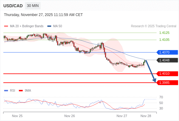 在 1.4070 之下,看跌,目标价位为 1.4010 ,然后为 1.3985 。