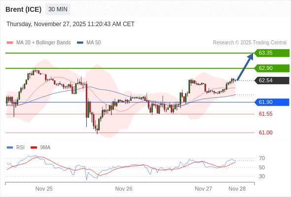在 61.90 之上,看涨,目标价位为 62.90 ,然后为 63.35 。