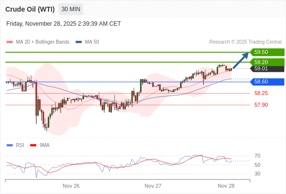 在 58.60 之上,看涨,目标价位为 59.20 ,然后为 59.50 。