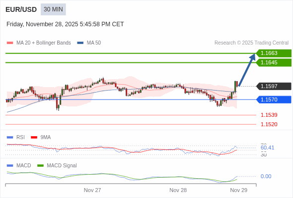 欧元/美元 当日内 : 看涨,当 1.1570 为支撑位。