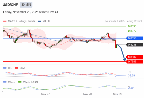 美元/瑞郎 当日内 : 看跌,在 0.8056 之下。