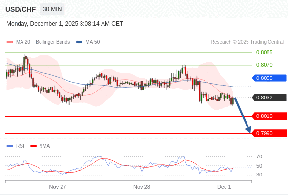 在 0.8055 之下,看跌,目标价位为 0.8010 ,然后为 0.7990 。