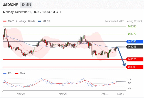 在 0.8055 之下,看跌,目标价位为 0.8020 ,然后为 0.8005 。