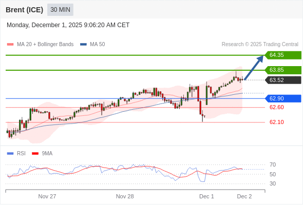 在 62.90 之上,看涨,目标价位为 63.85 ,然后为 64.35 。