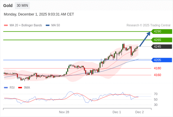 在 4205 之上,看涨,目标价位为 4265 ,然后为 4290 。