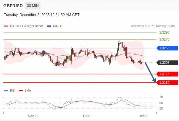 在 1.3250 之下,看跌,目标价位为 1.3175 ,然后为 1.3150 。