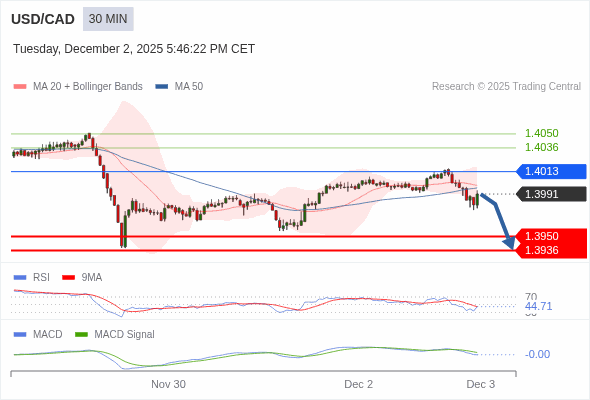 美元/加元 当日内 : 看跌,在 1.4013 之下。
