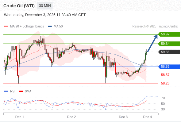 在 58.85 之上,看涨,目标价位为 59.64 ,然后为 59.97 。