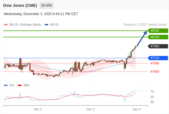 在 47710 之上,看涨,目标价位为 48190 ,然后为 48335 。