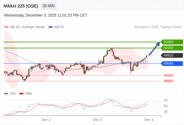 日经225股指期货 (OSE) 当日内: 在49640之上,看涨。