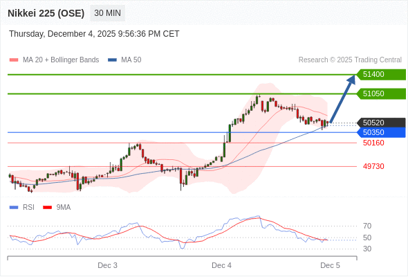 在 50350 之上,看涨,目标价位为 51050 ,然后为 51400 。