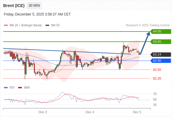 在 62.90 之上,看涨,目标价位为 63.65 ,然后为 64.05 。