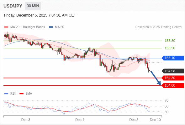 在 155.10 之下,看跌,目标价位为 154.30 ,然后为 154.00 。