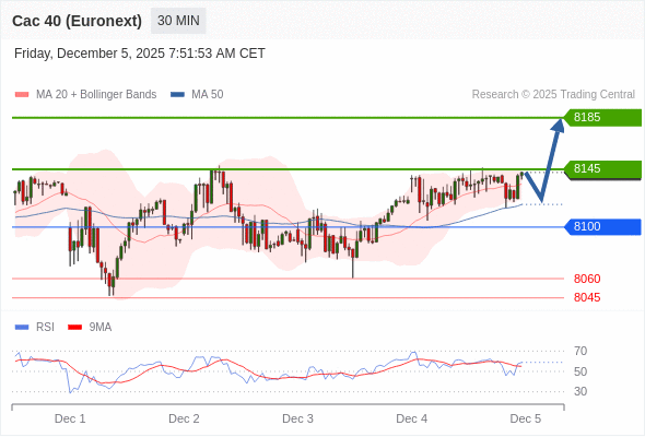 法国CAC指数期货 (Euronext) (Z5) 当日内: 在8100之上,看涨。