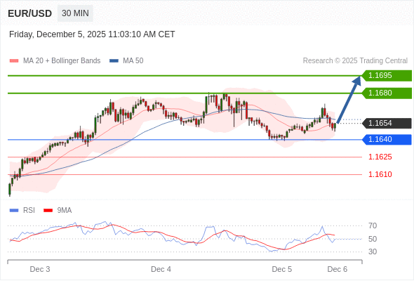 在 1.1640 之上,看涨,目标价位为 1.1680 ,然后为 1.1695 。