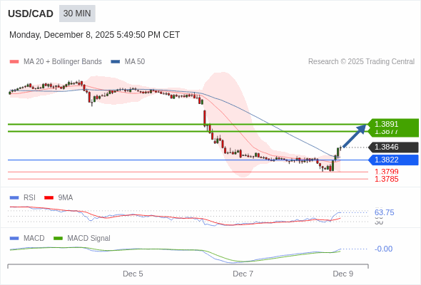 美元/加元 当日内 : 看涨,当 1.3822 未被跌破。