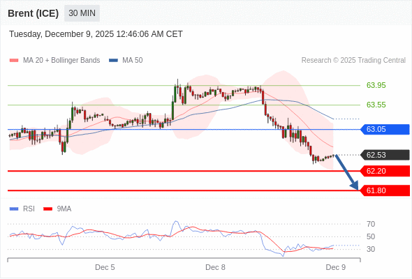 在 63.05 之下,看跌,目标价位为 62.20 ,然后为 61.80 。