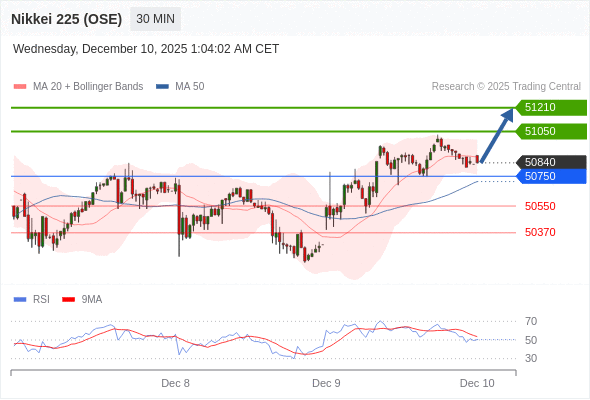在 50750 之上,看涨,目标价位为 51050 ,然后为 51210 。