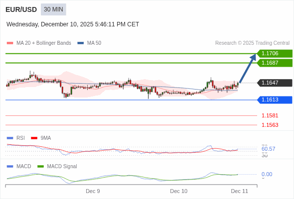 技术点评: RSI技术指标大于中性区域50。 MACD技术指标处在其信号线之上看多。 配置为正。 此外,价位高于其20天及50天移动平均线 ( 分别位于1.1640 和1.1633 )。