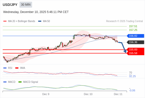 美元/日元 当日内 : 看跌,在 156.82 之下。