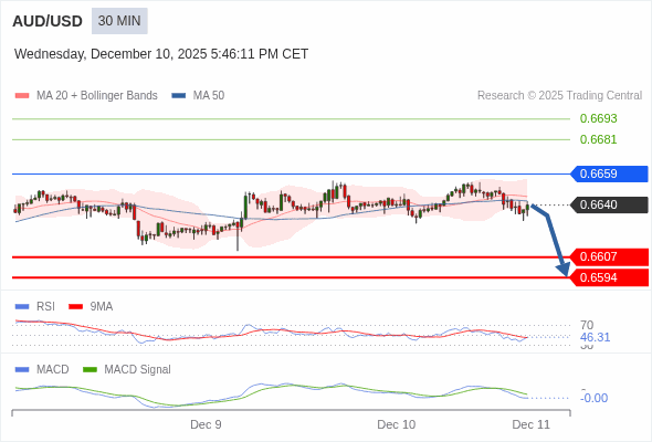澳元/美元 当日内 : 看跌,在 0.6659 之下。