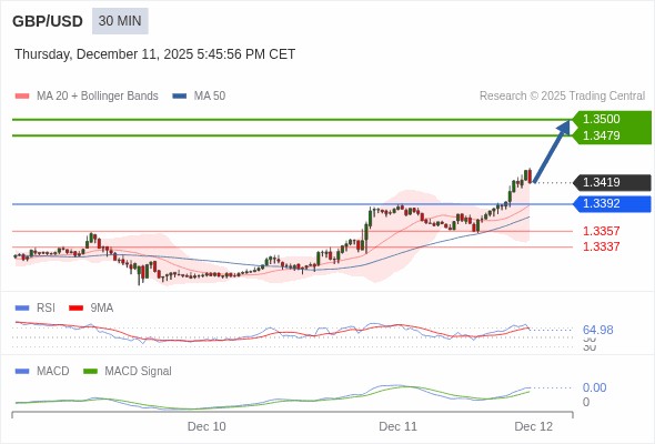 技术点评: RSI技术指标大于中性区域50。 MACD技术指标处在其信号线之上看多。 配置为正。 此外,价位高于其20天及50天移动平均线 ( 分别位于1.3390 和1.3375 )。