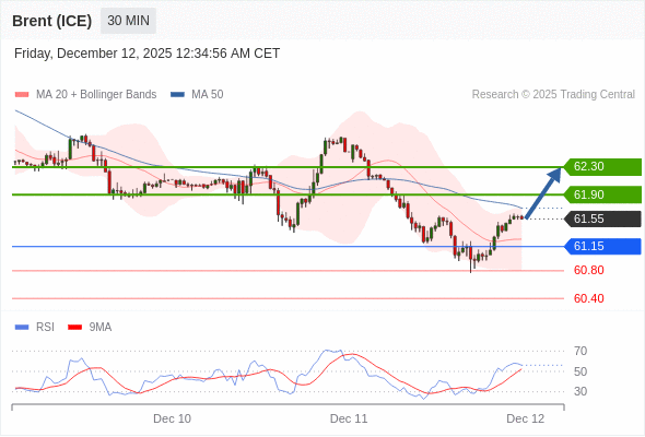 在 61.15 之上,看涨,目标价位为 61.90 ,然后为 62.30 。